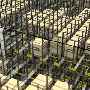 堆垛型母車乘載穿梭子車做上下前後移動,抵達儲位出入口後再由穿梭子車深入至料架存取貨品,適合新廠房規劃、場地夠高夠深貨物大批量、大SKU數貨品存取的最佳解決方案。